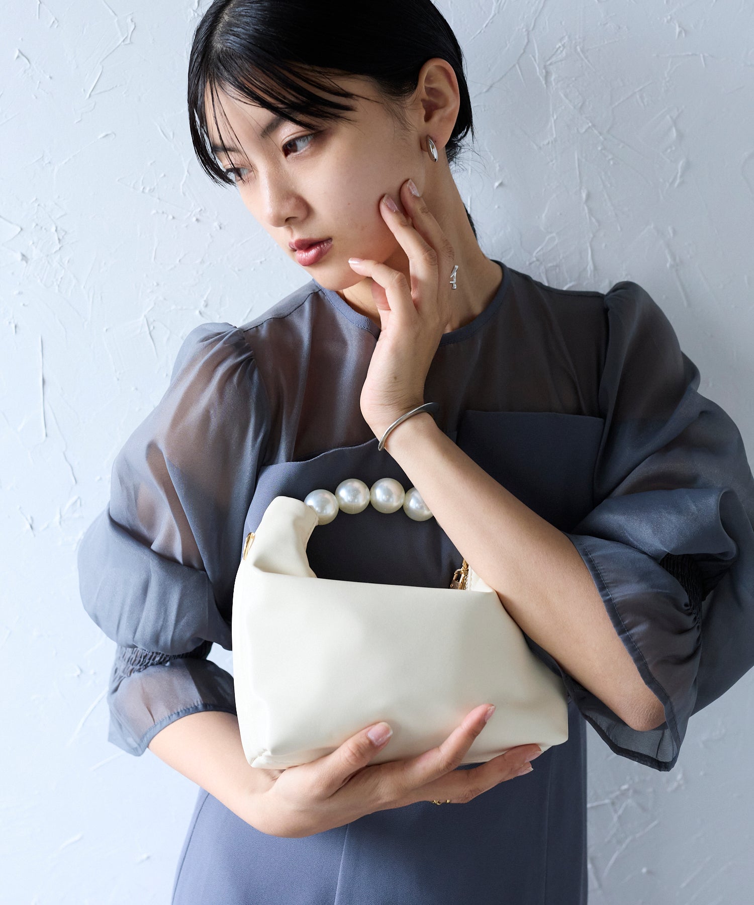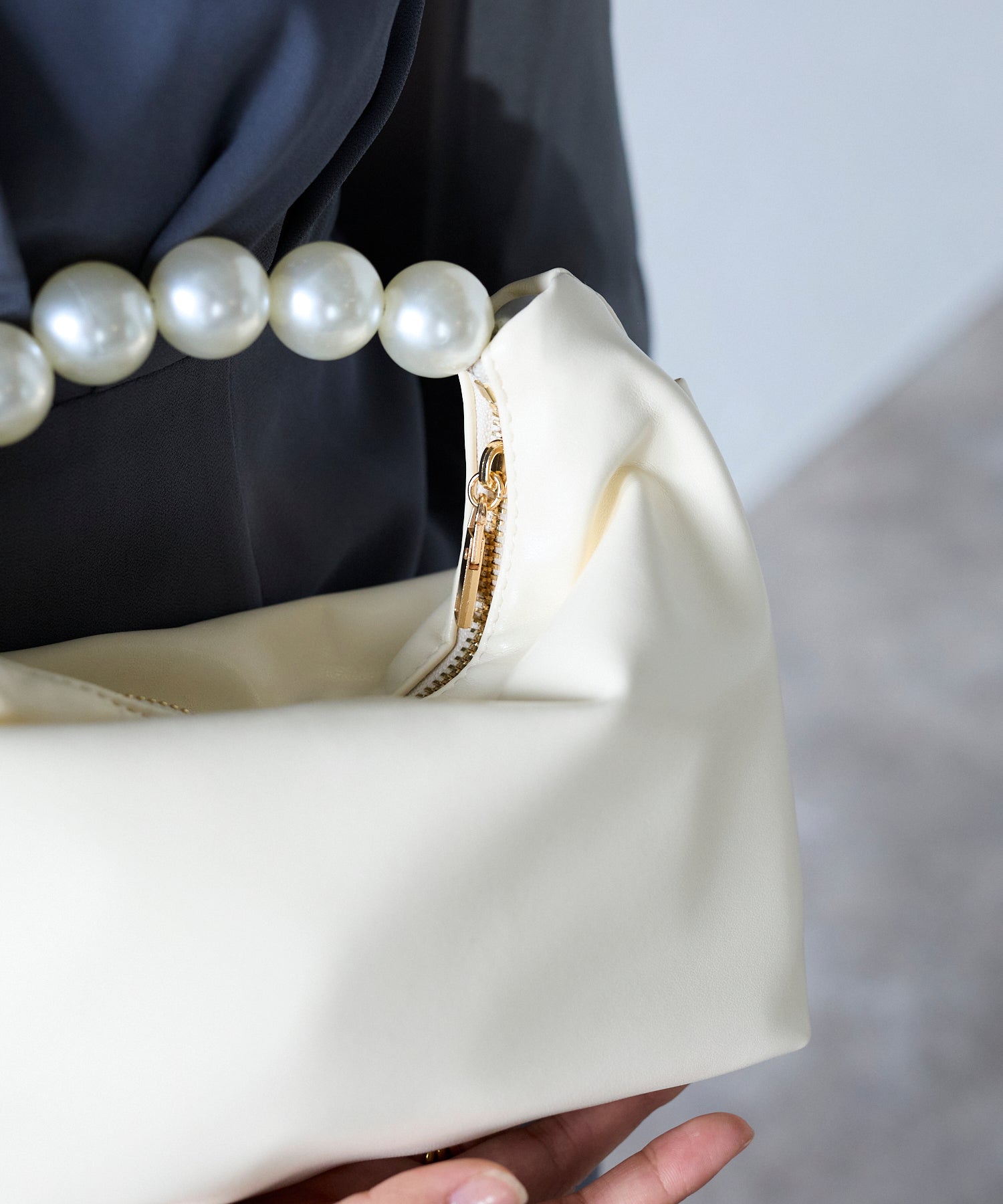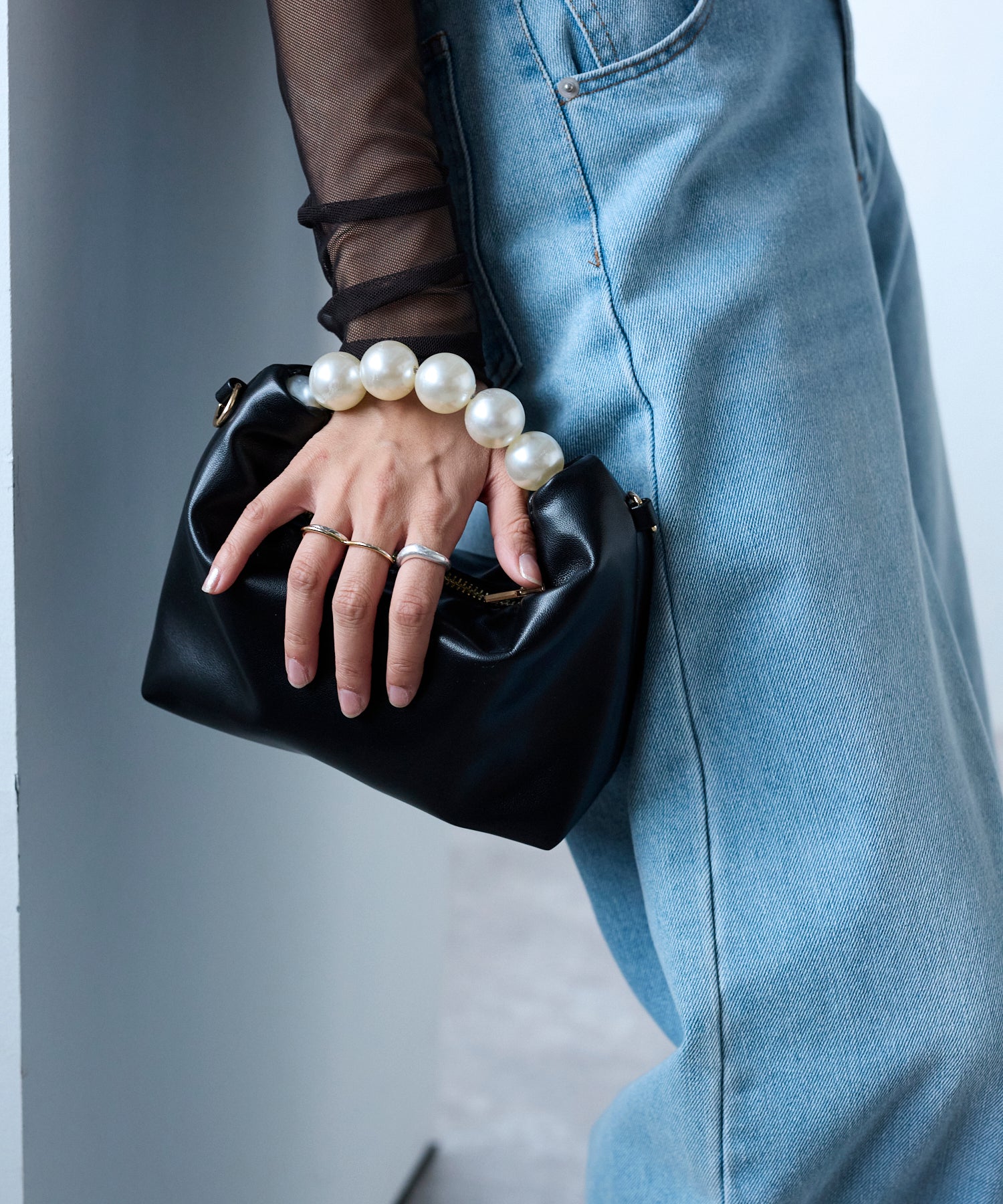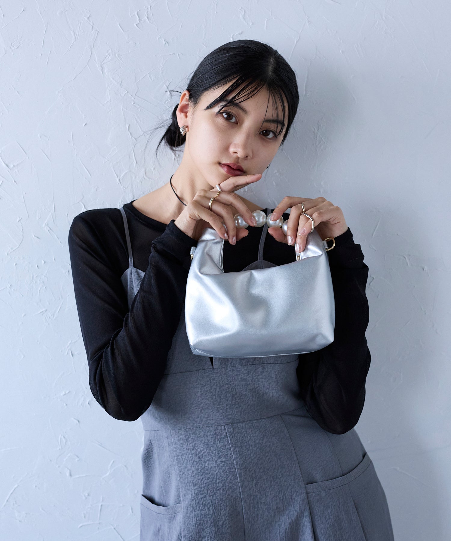 大きめのパールハンドルが特徴で、アクセ感覚でコーデに合わせやすいフェイクレザーバッグ