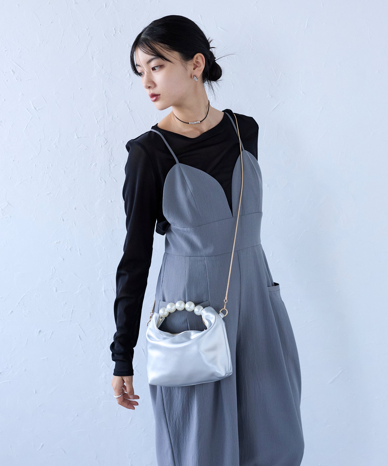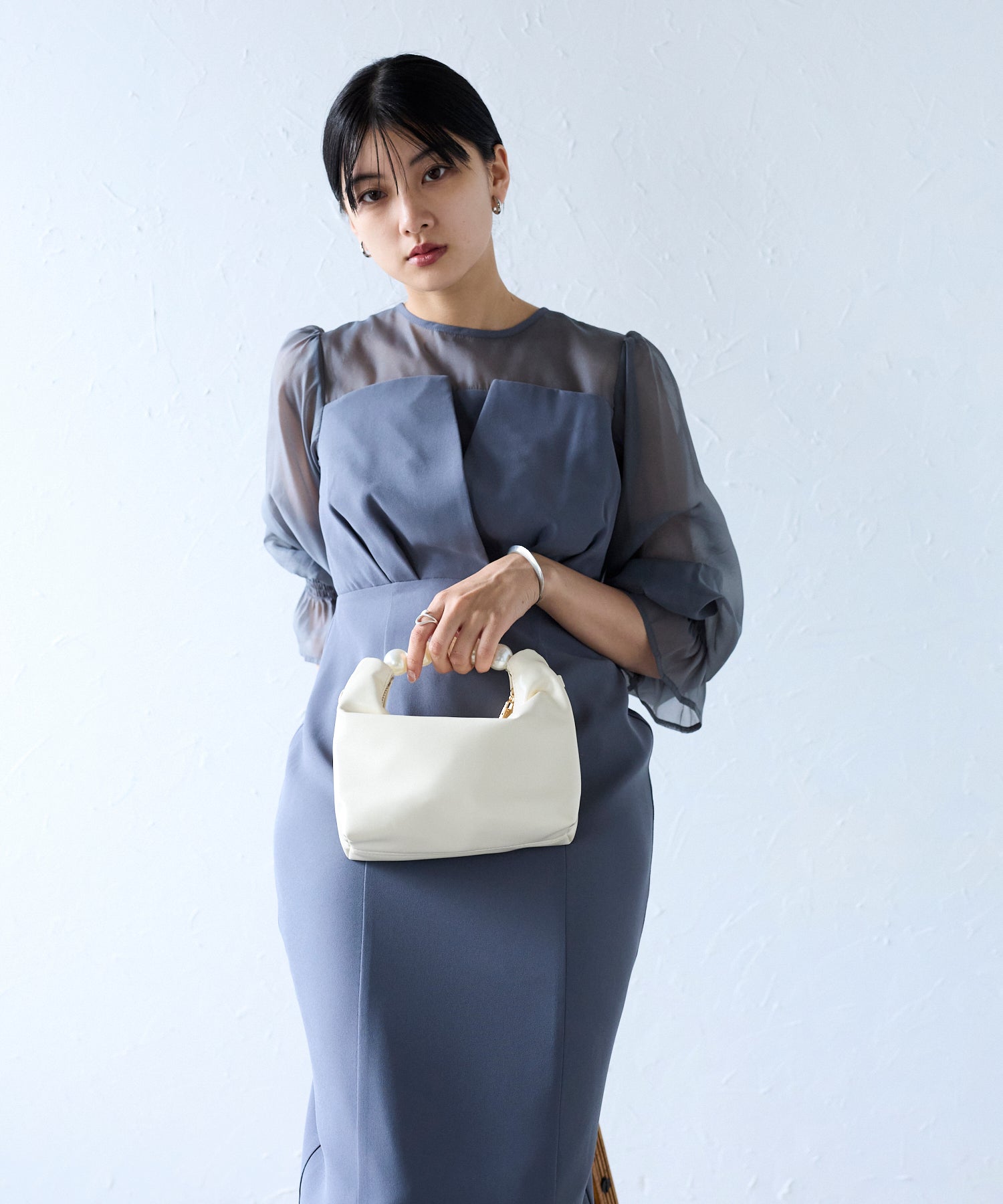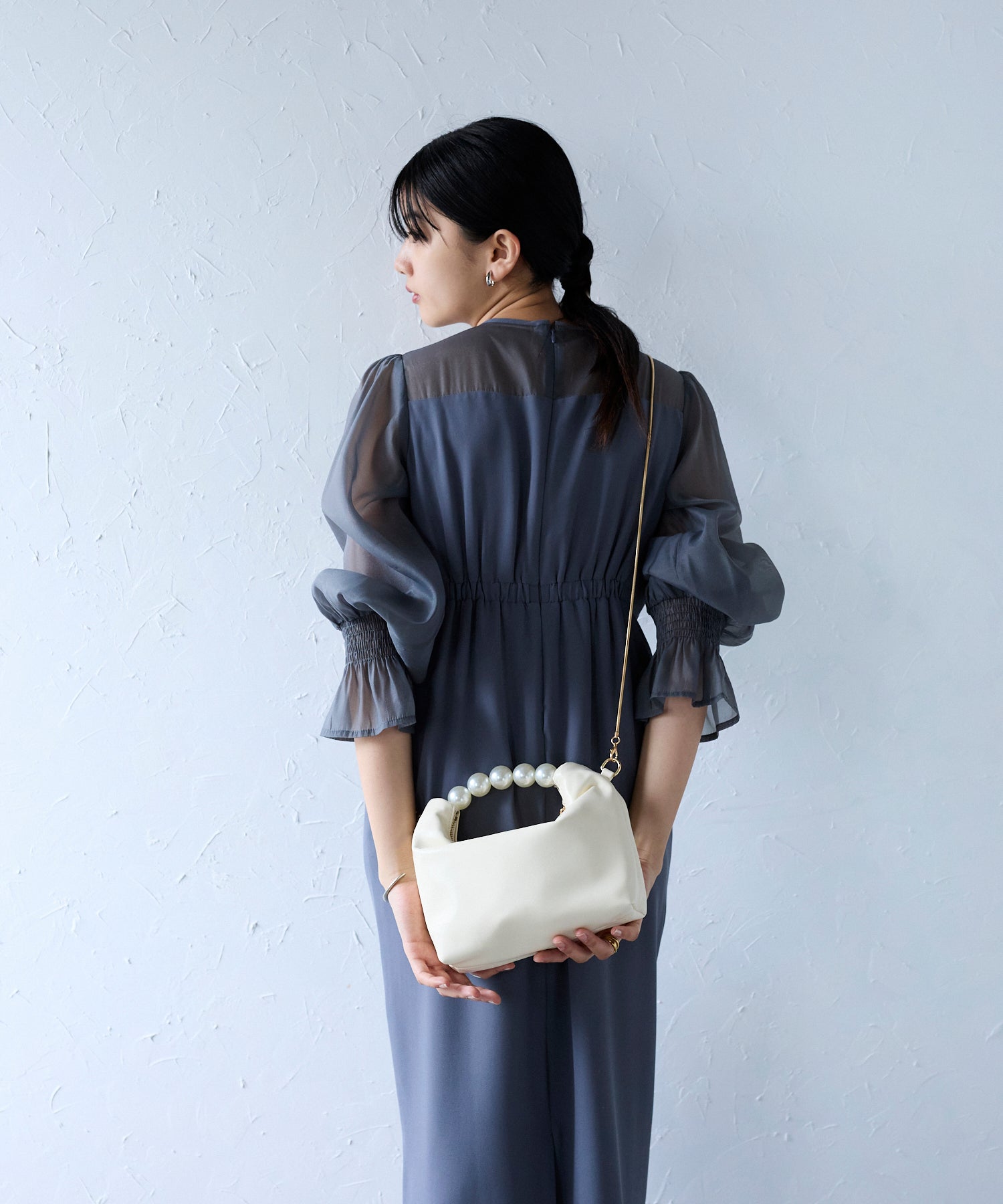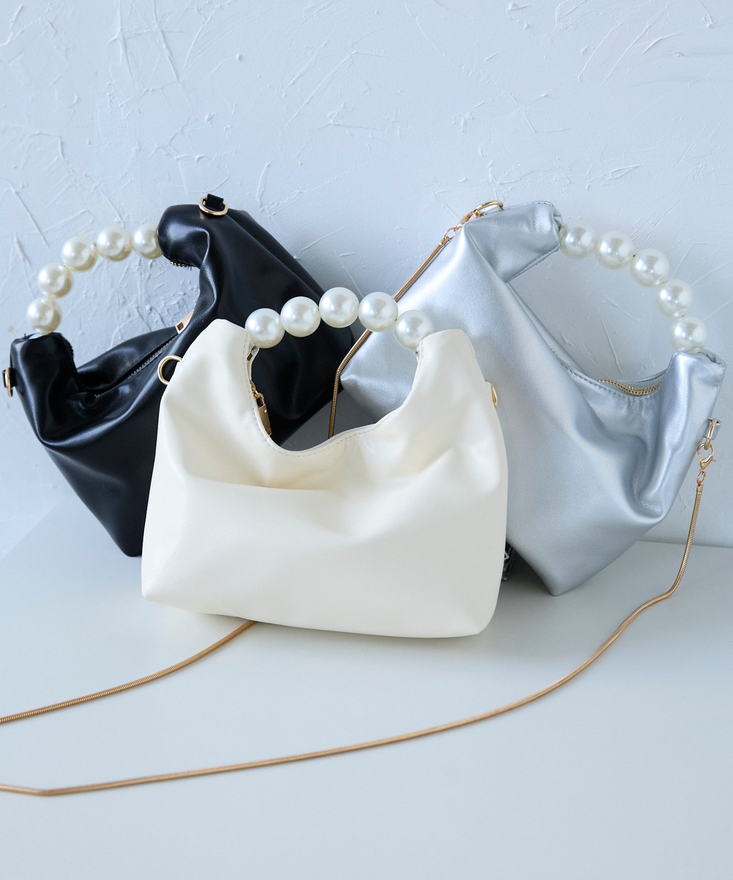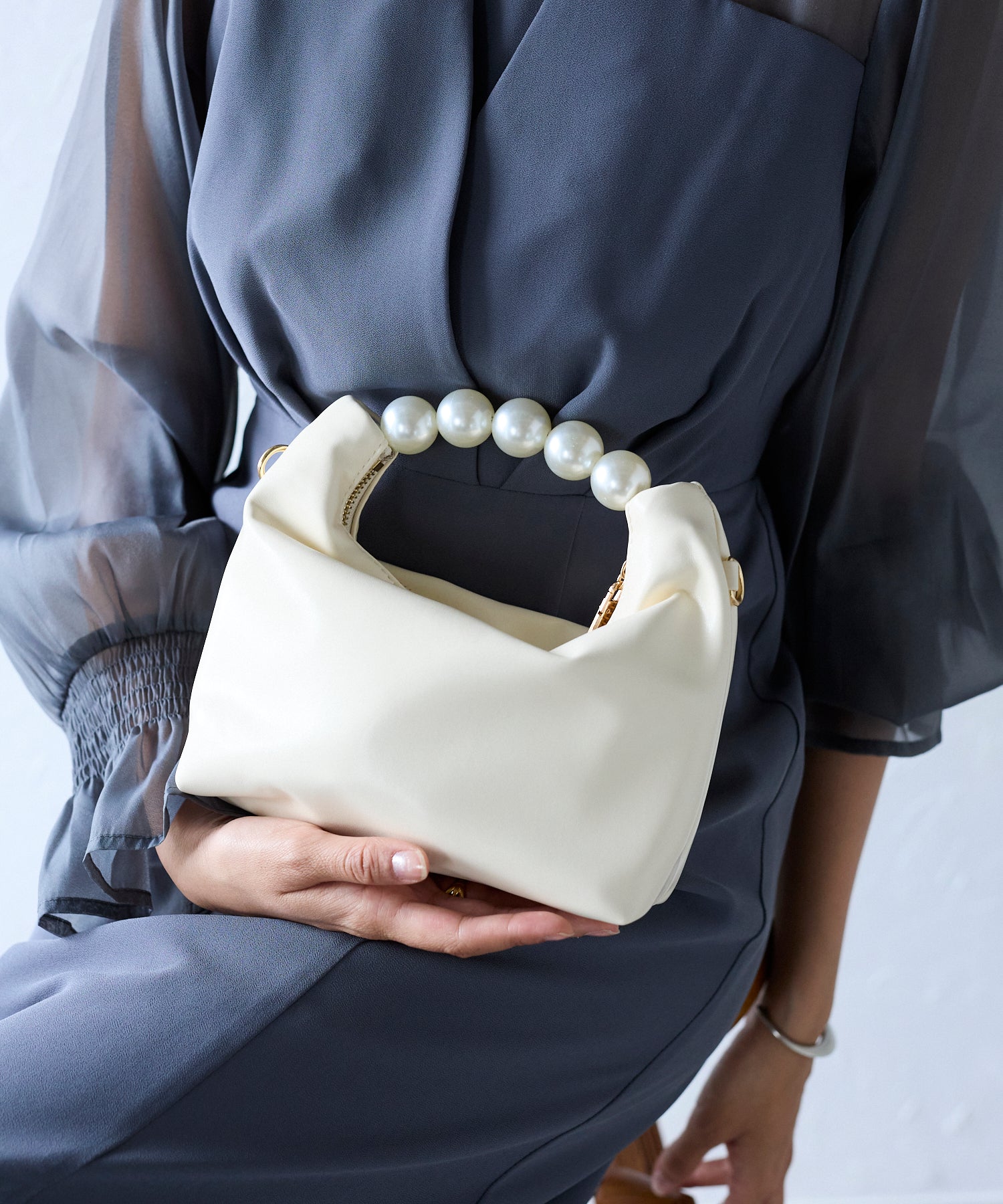 大きめのパールハンドルが特徴で、アクセ感覚でコーデに合わせやすいフェイクレザーバッグ