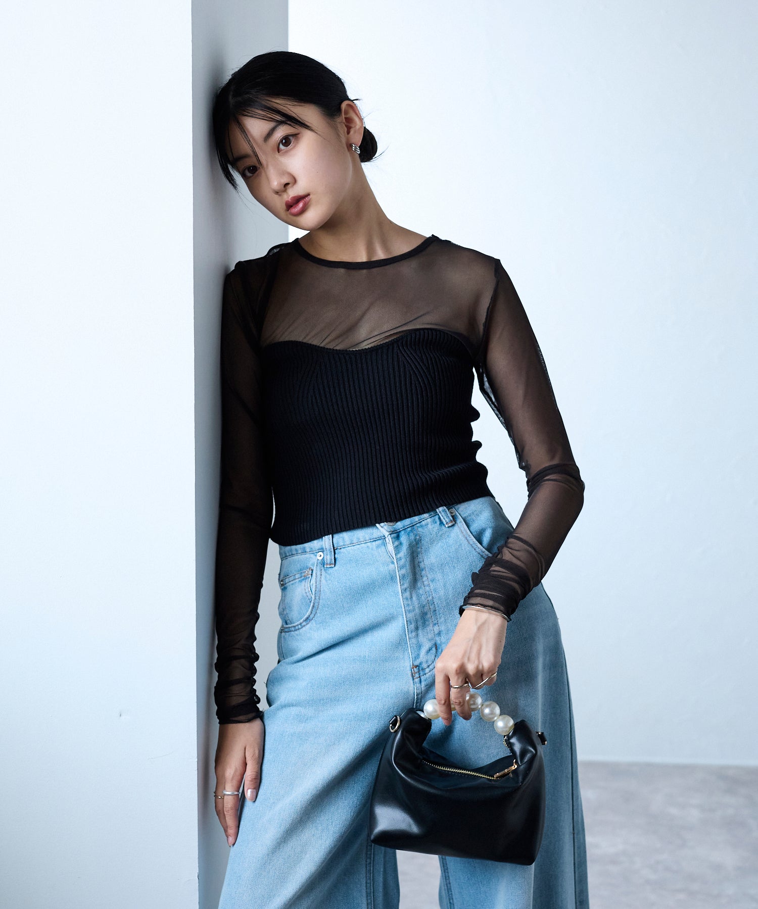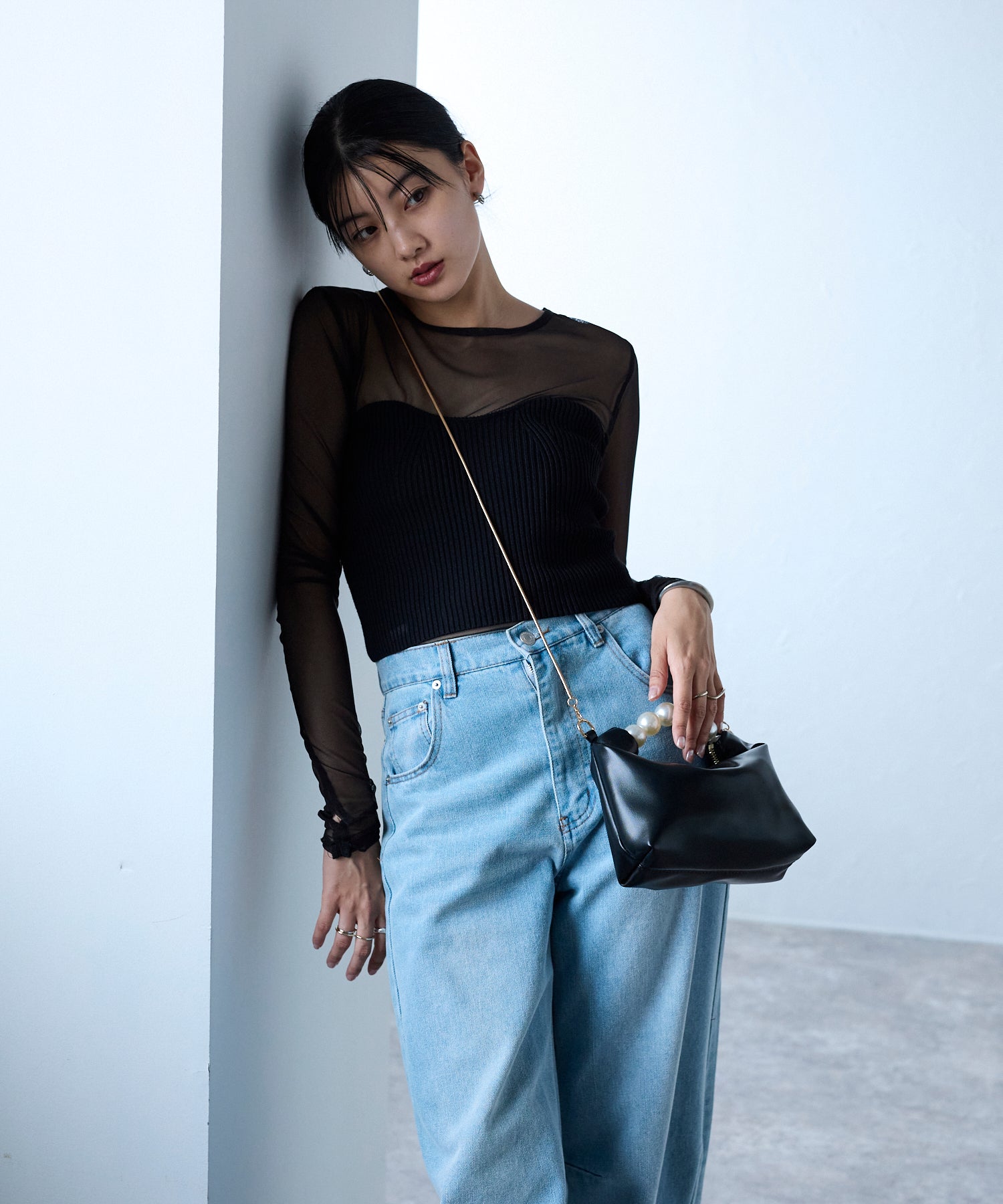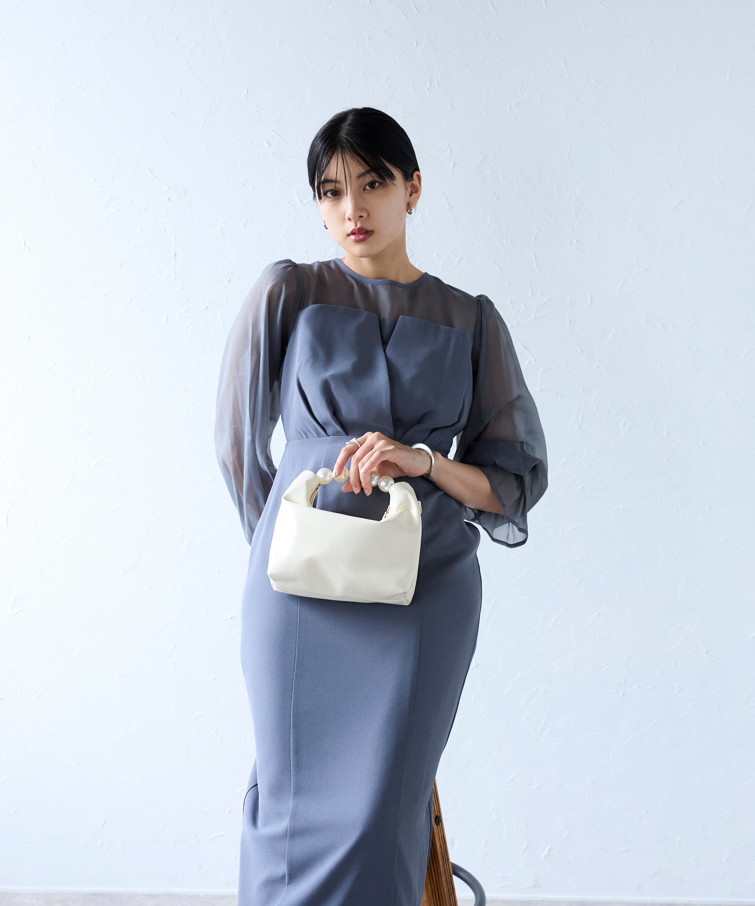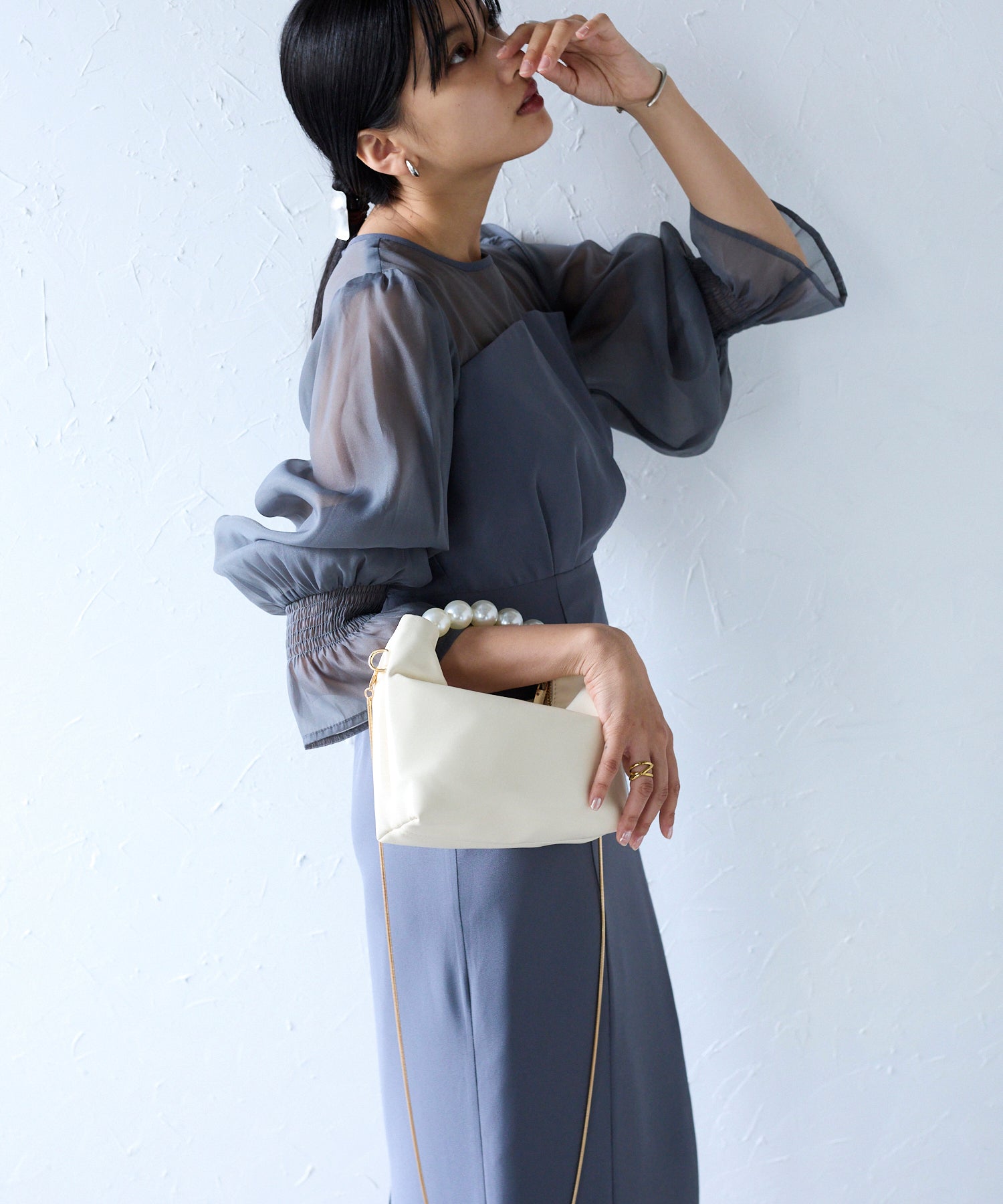 大きめのパールハンドルが特徴で、アクセ感覚でコーデに合わせやすいフェイクレザーバッグ