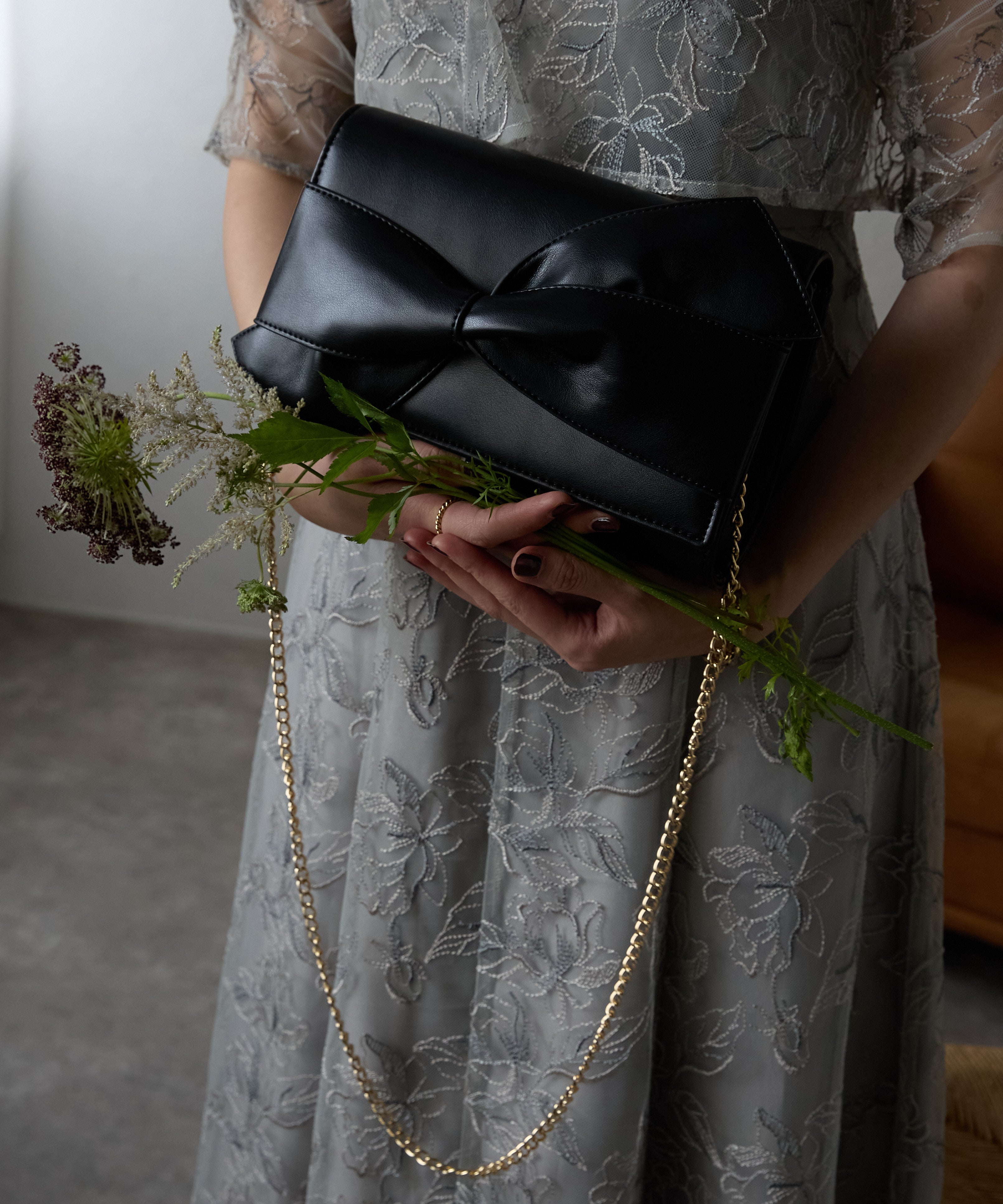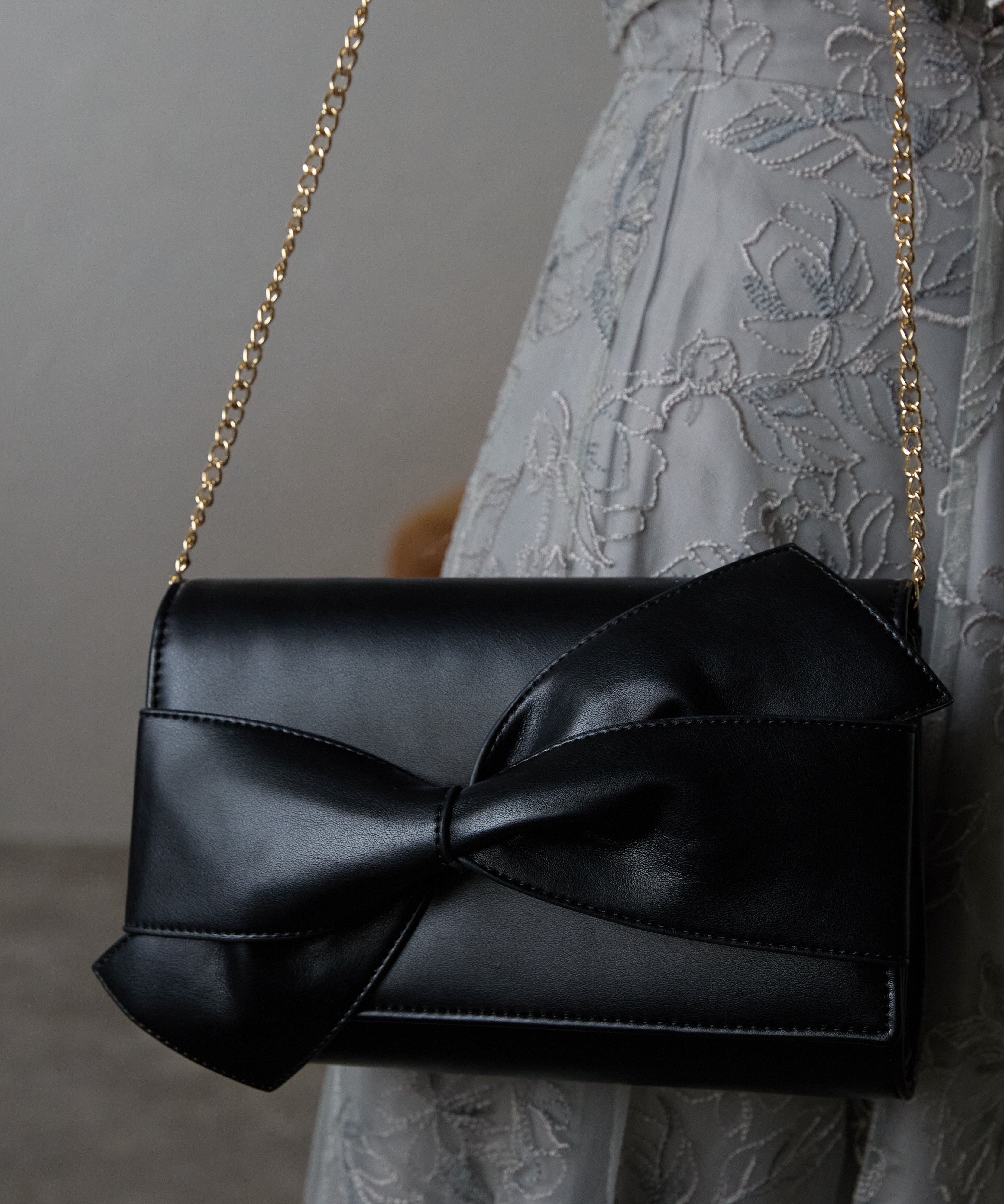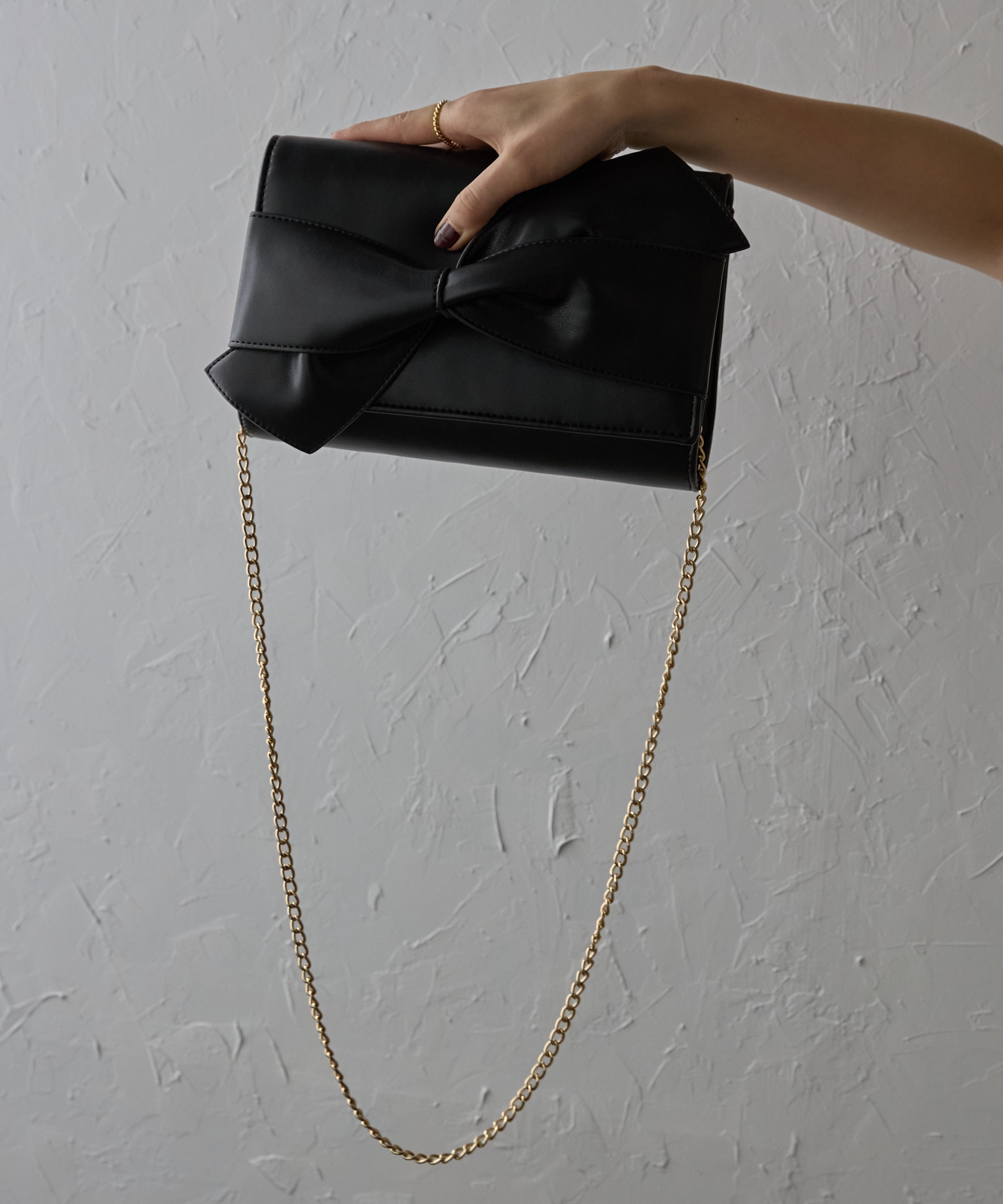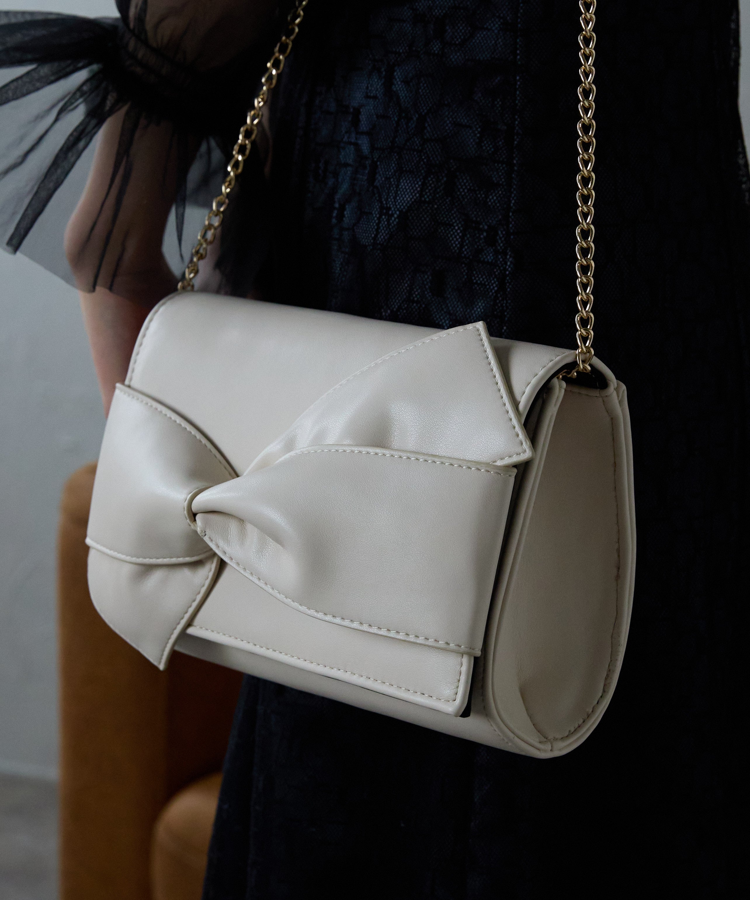 大きなフロントリボンが魅力的なフェイクレザーフラップバッグ