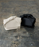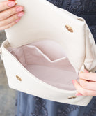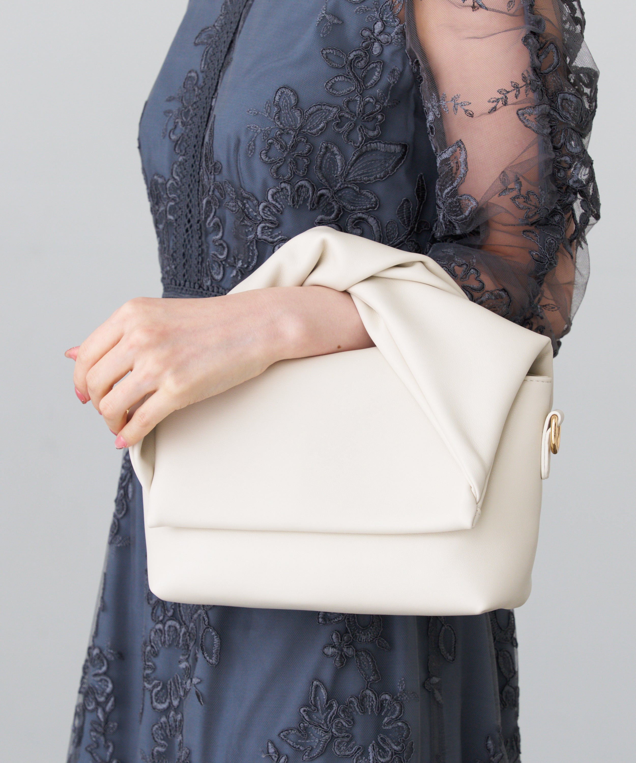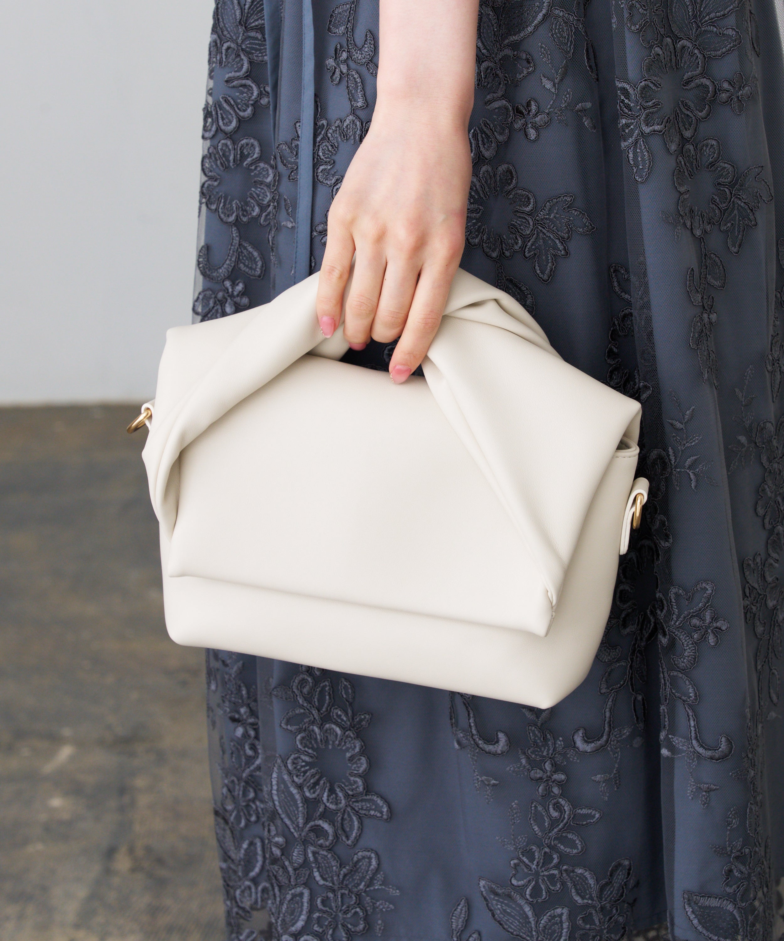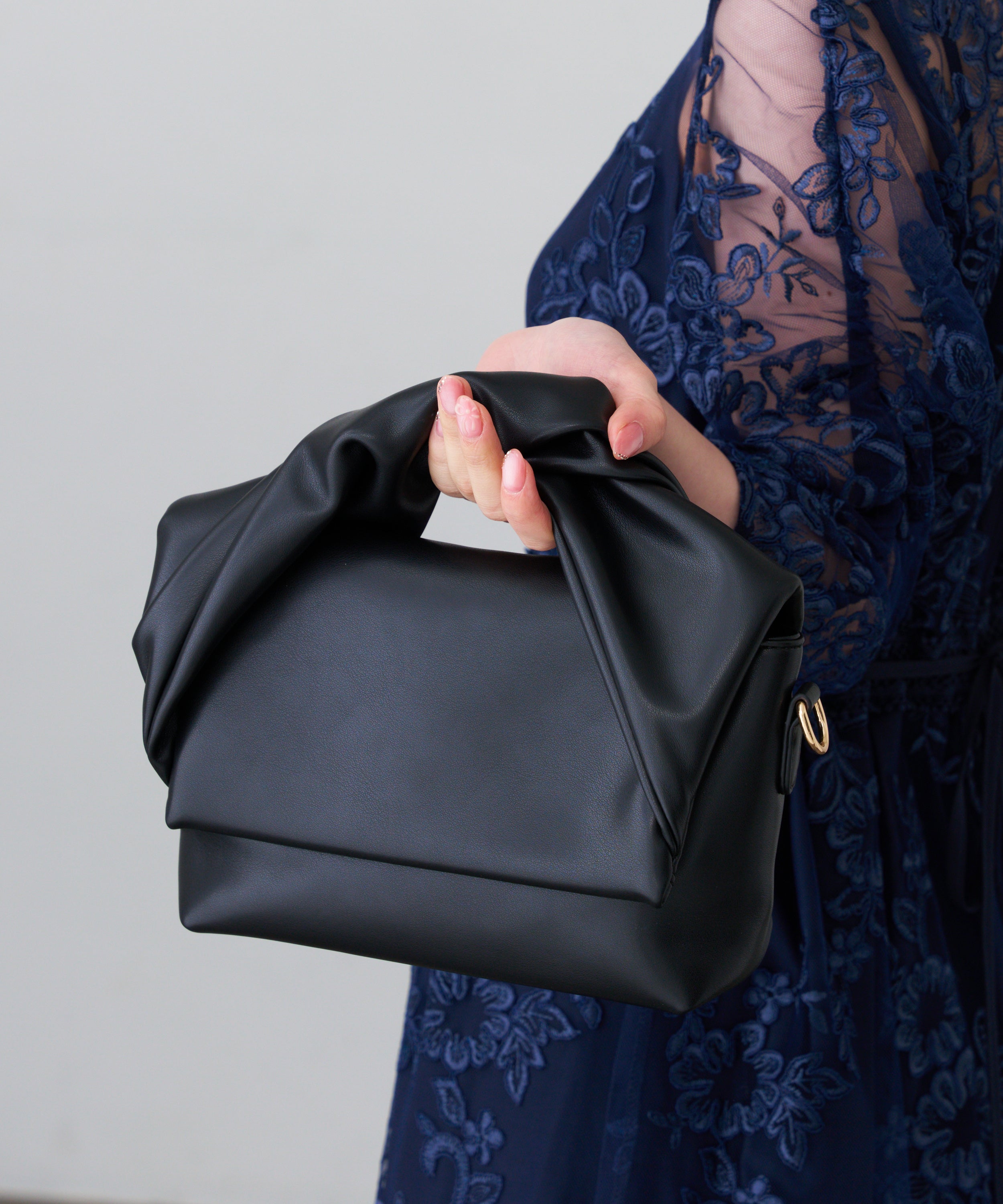 ツイストハンドルが特徴的なフェイクレザーフラップバッグ