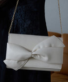 大きなフロントリボンが魅力的なフェイクレザーフラップバッグ